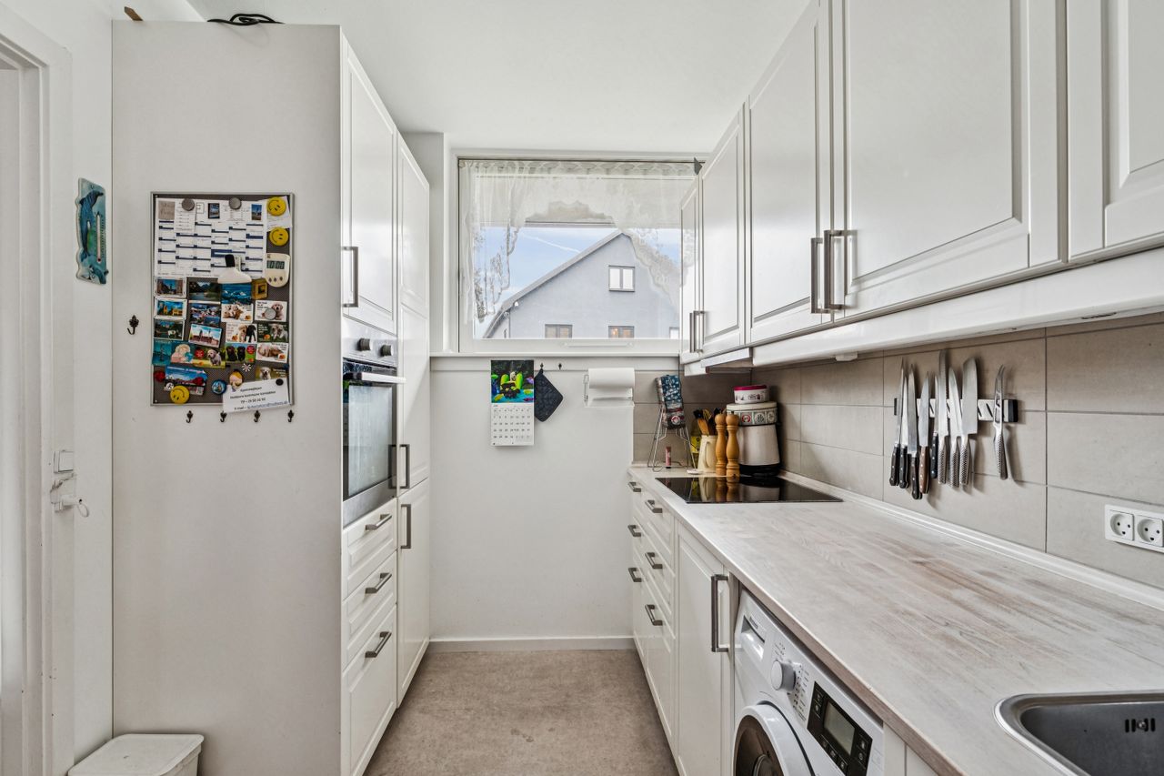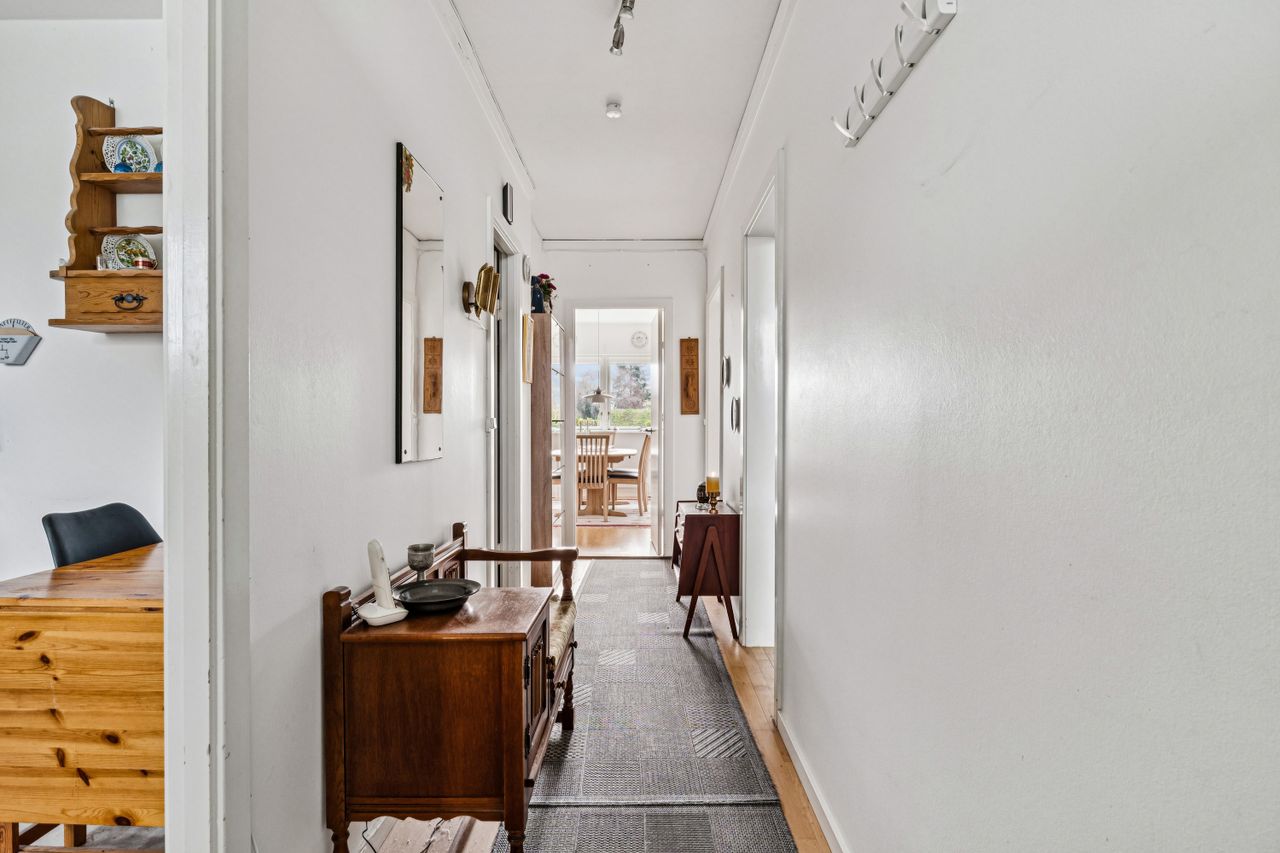 Entre/fordelingsgang, pænt lyst køkken med spiseplads, stort pænt soveværelse med plads til både dobbeltseng, skab og skrivebord. Pænt børneværelse/kontor/spisestue, pænt hvidt flisebadeværelse med terrazzogulv og bruseafsnit. Skøn lys opholdsstue med udgang til egen have, hvorfra der er udsigt over de grønne fællesarealer. Der er pæne parketgulve i hele lejligheden og lejligheden har filt på alle vægge.