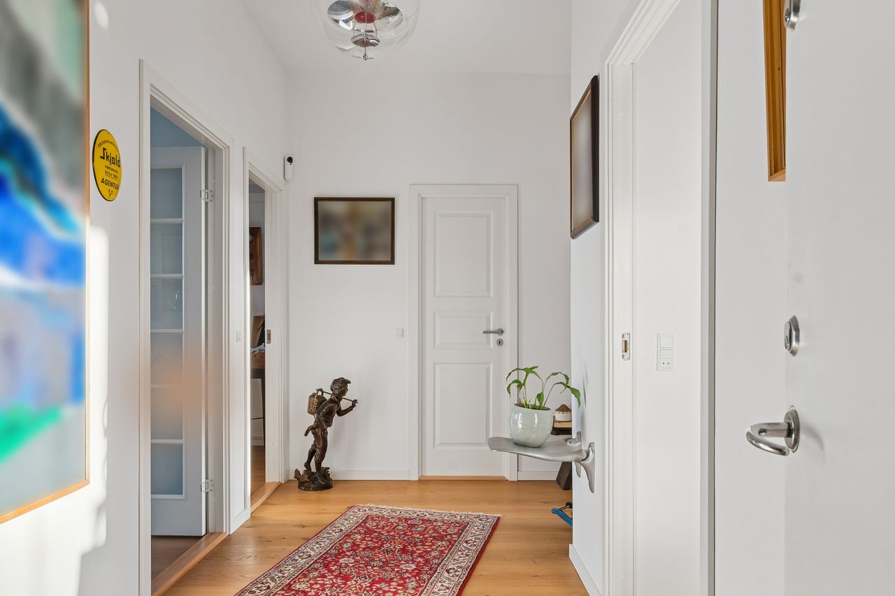Boligen rummer to gode værelser. Fra det største værelse er der udgang til lejlighedens anden altan, som vender mod sydvest og giver gode muligheder for at nyde eftermiddagssolen. Badeværelset er stilrent indrettet med glasafskærmet bruseniche.